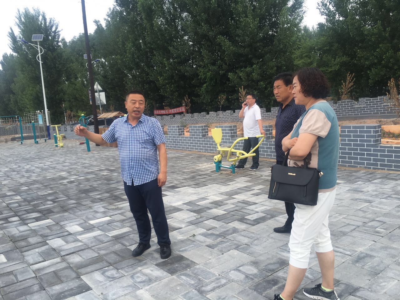 (該圖為扶貧工作組和村干部溝通移動(dòng)舞臺(tái)搭建事宜)